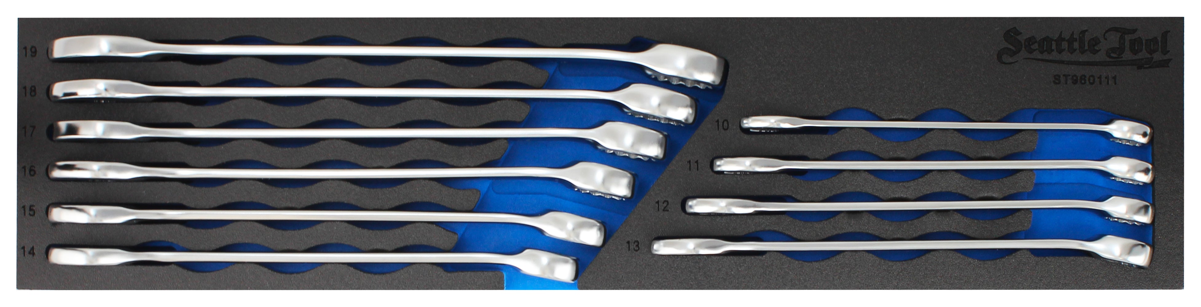 The Seattle Tool 10 Piece Metric Combination Wrench Set is compact metric wrench set for jobs around the home and shop. The set includes metric wrenches from 10mm to 19mm without skipping any sizes. Compact and low profile design improves accessibility to fasteners. Non-slip open end improves grip on fasteners and minimizes rounding and stripping. The body is forged, machined and precision heat treated for strength and durability to tackle tough jobs. Finished in scratch, chip and corrosion resistant satin nickel-chrome plating. PE+EVA foam shadow tray keeps the tools organized and secured.