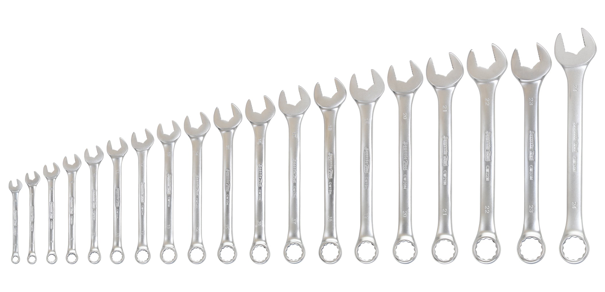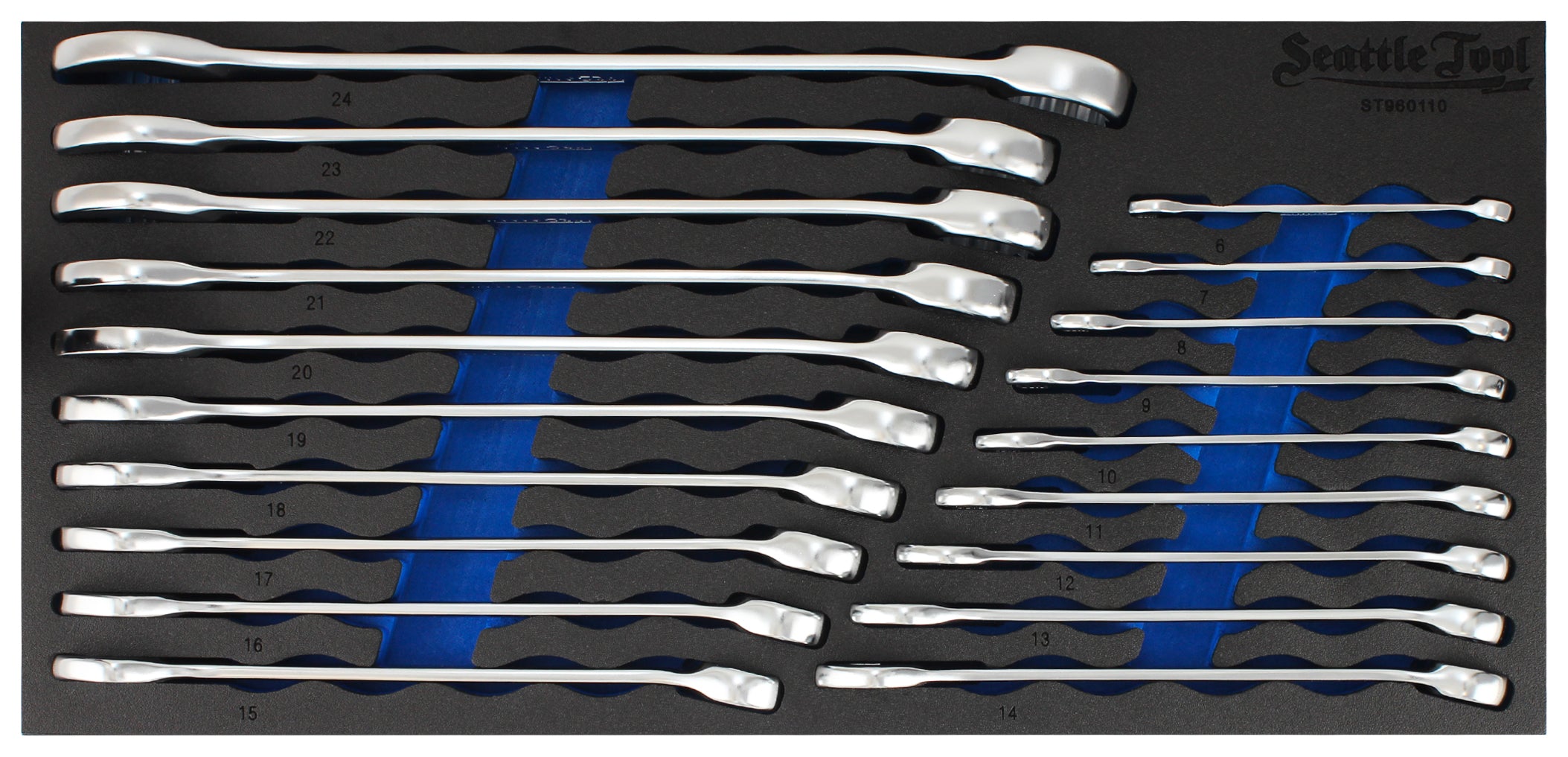 The Seattle Tool 19 Piece Metric Combination Wrench Set is a complete metric wrench set for professionals. The set includes metric wrenches from 6mm to 24mm without skipping any sizes. Compact and low profile design improves accessibility to fasteners. Non-slip open end improves grip on fasteners and minimizes rounding and stripping. The body is forged, machined and precision heat treated for strength and durability to tackle tough jobs. Finished in scratch, chip and corrosion resistant satin nickel-chrome plating. PE+EVA foam shadow tray keeps the tools organized and secured.