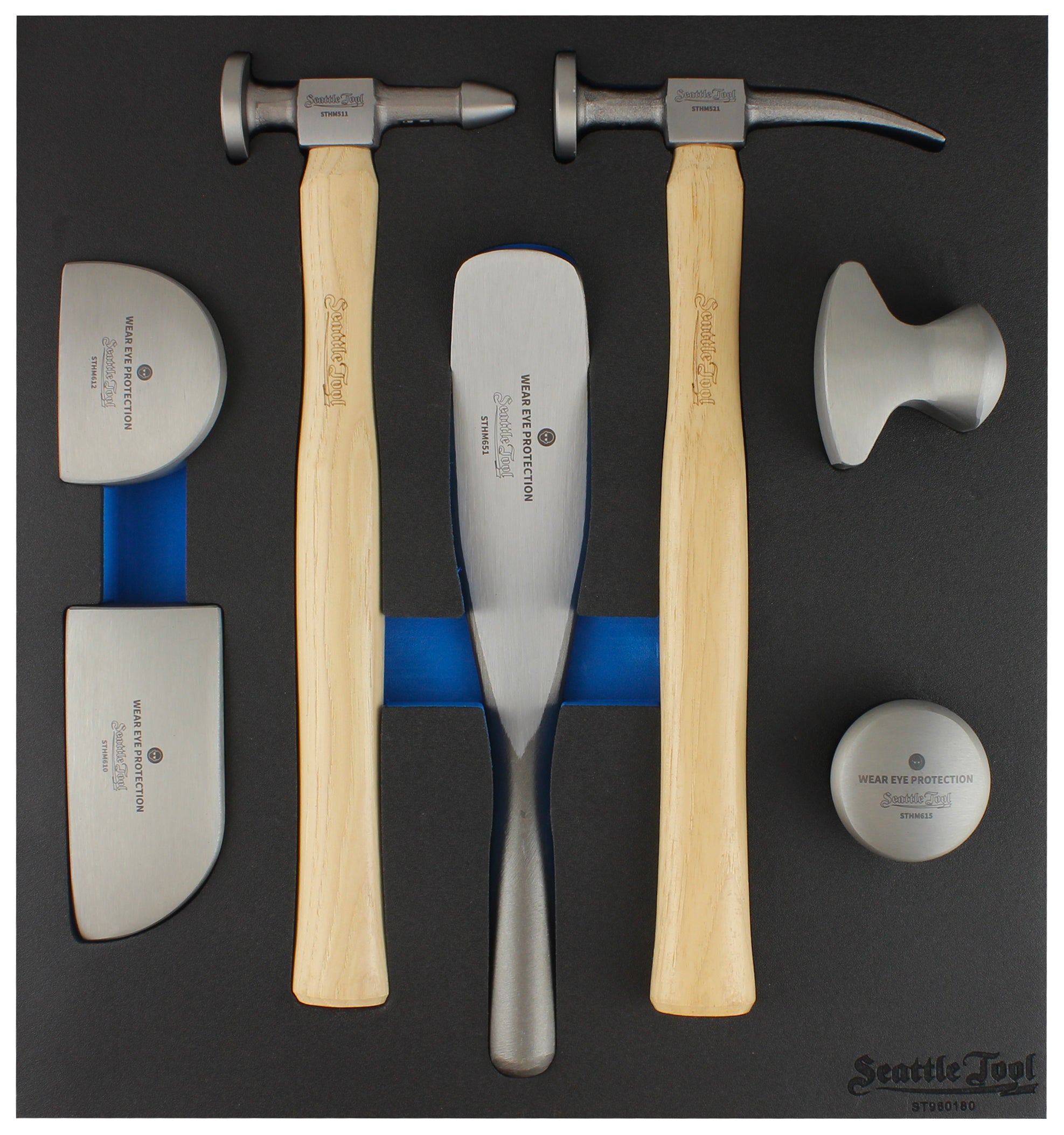The Seattle Tool 7 Piece Hammer and Dolly Set features 7 common body hammers, dollies and spoon used in a wide variety of common auto body and sheet metal work. The hammers and dollies are precision forged, machined and heat-treated to provide excellent durability and strength. Balanced handle made from premium hickory provides comfort and control when working. Dollies provide a variety of low and high crowns, flat surfaces and different radii for a wide variety of shapes and applications. PE+EVA foam shadow tray keeps the tools organized and secured.