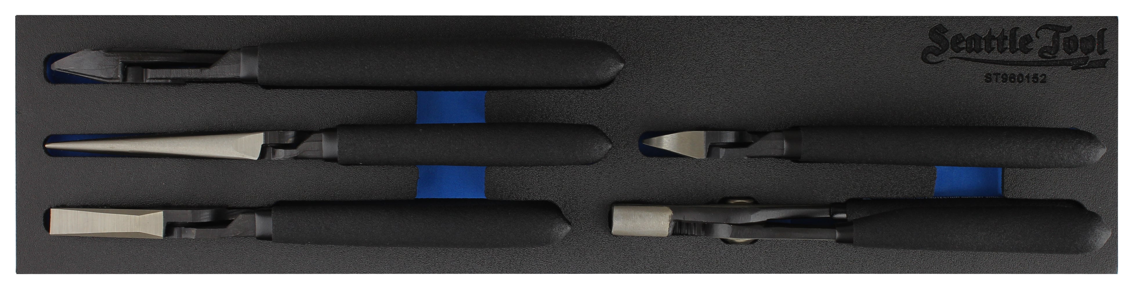 The Seattle Tool 5 Piece Pliers Set features 5 common pliers and cutters used in a wide range of jobs. Pliers are precision forged, machined and heat-treated to provide excellent durability and strength. High leverage design reduces user exertion and fatigue. Cutting edges are precision ground and induction hardened for long lasting sharpness and repeated cuts. Low profile, compact design maximizes maneuverability and usability in tight spaces. Plier handles are double-dipped with a textured exterior to provide durability, comfort and control. PE+EVA foam shadow tray keeps the tools organized and secured.