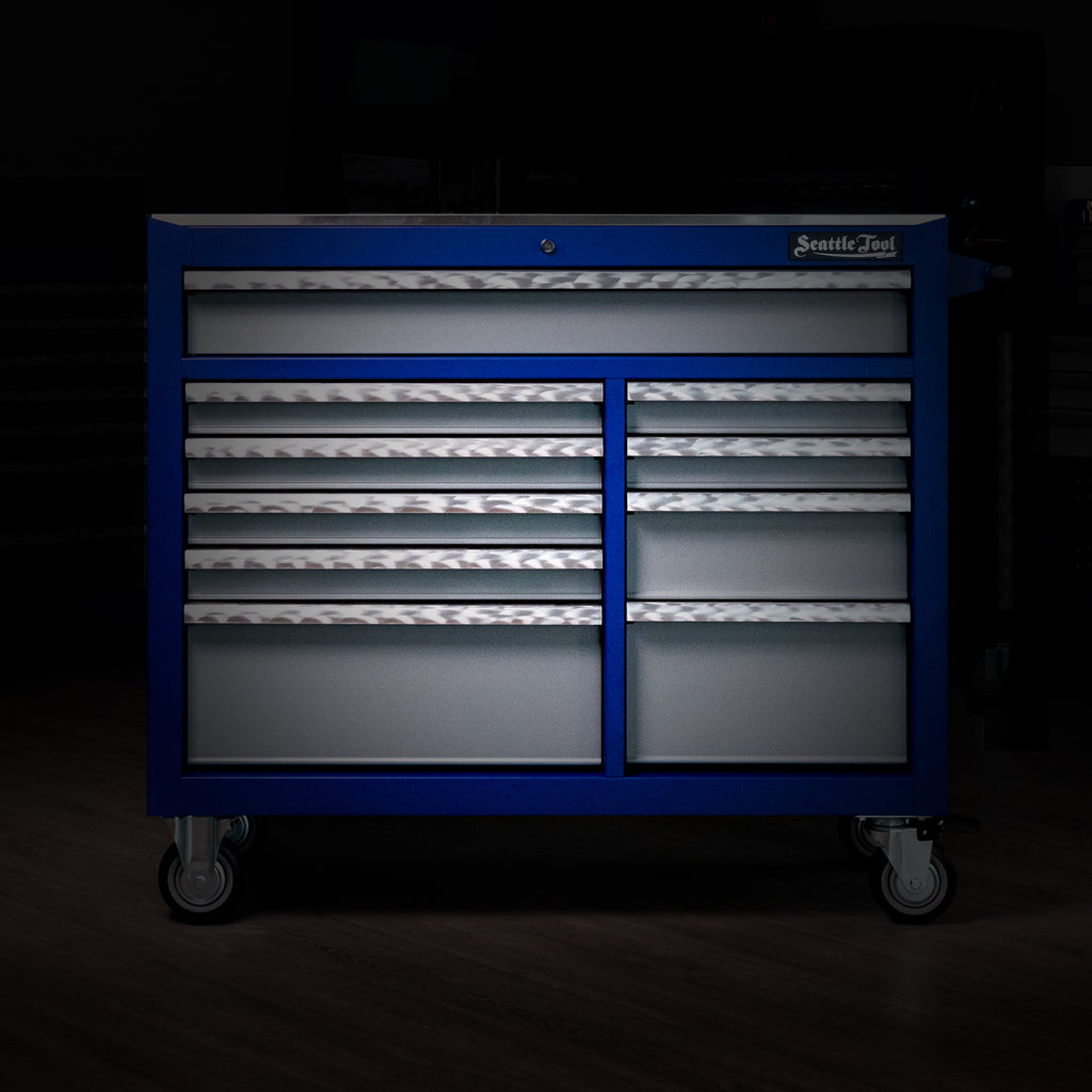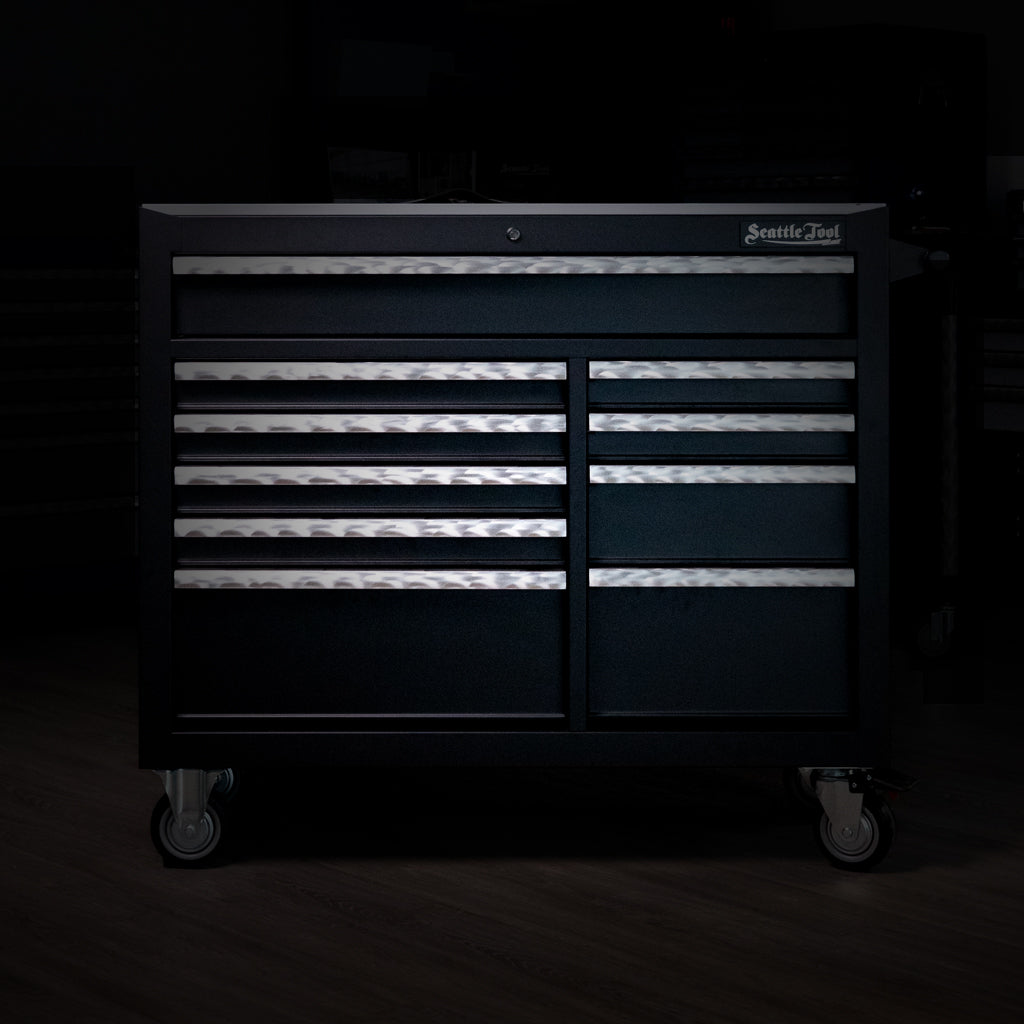 The Seattle Tool 45" Elite Series Tool Cabinet is a professional roller cabinet suitable for use in the garage and professional shops. Dual-bank configuration with 10 drawers - including a full width drawer - provide secure storage and organization for hand tools, supplies and power tools. A deep power drawer with detachable external power cable keeps your tools and devices charged without compromising mobility. Premium ball bearing slides ensure smooth and sturdy action for the reinforced drawers. Anti-drift latches prevent drawers from drifting open while being easy and intuitive to operate. Double-wall design and high density welds result in a heavy duty box with lasting durability. Constructed from cold rolled steel with scratch, grease and solvent resistant powder coating. Secured with a tubular lock and keys.