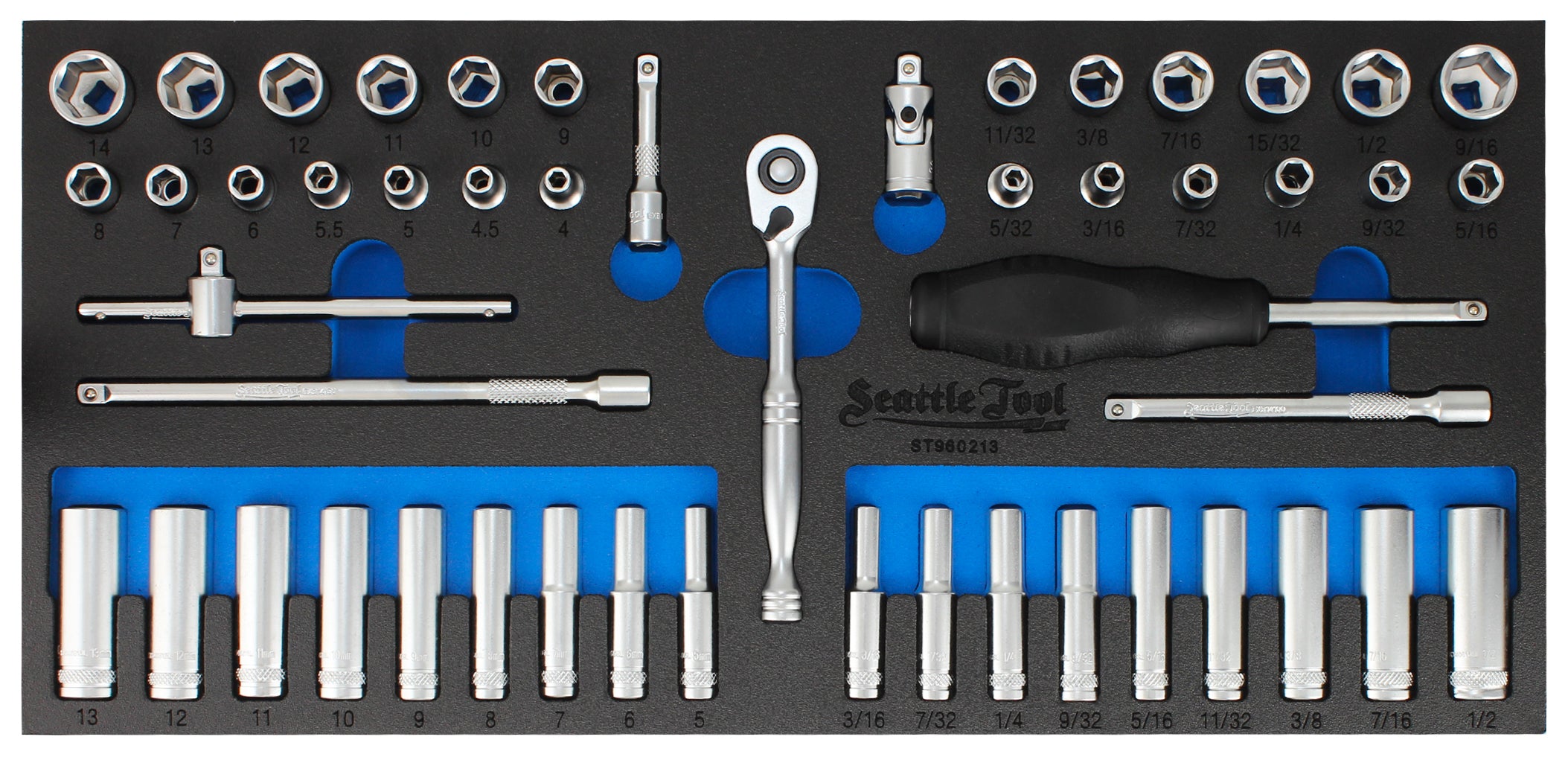 The Seattle Tool 1/4” Socket and Driver Set is a handy 1/4” drive solution for a wide variety of jobs from the home to the shop. The set features premium 1/4” drive sockets and deep sockets in both metric and SAE sizes. A 72-teeth compact head ratchet provides smooth, fine action and accessibility in tight spaces. The spinner handle, sliding t-handle, universal joint and three sizes of extensions makes this set versatile to tackle a wide range of jobs. Forged, machined and precision heat treated for strength and durability to tackle tough jobs. Finished in scratch, chip and corrosion resistant satin nickel-chrome plating. PE+EVA foam shadow tray keeps the tools organized and secured.