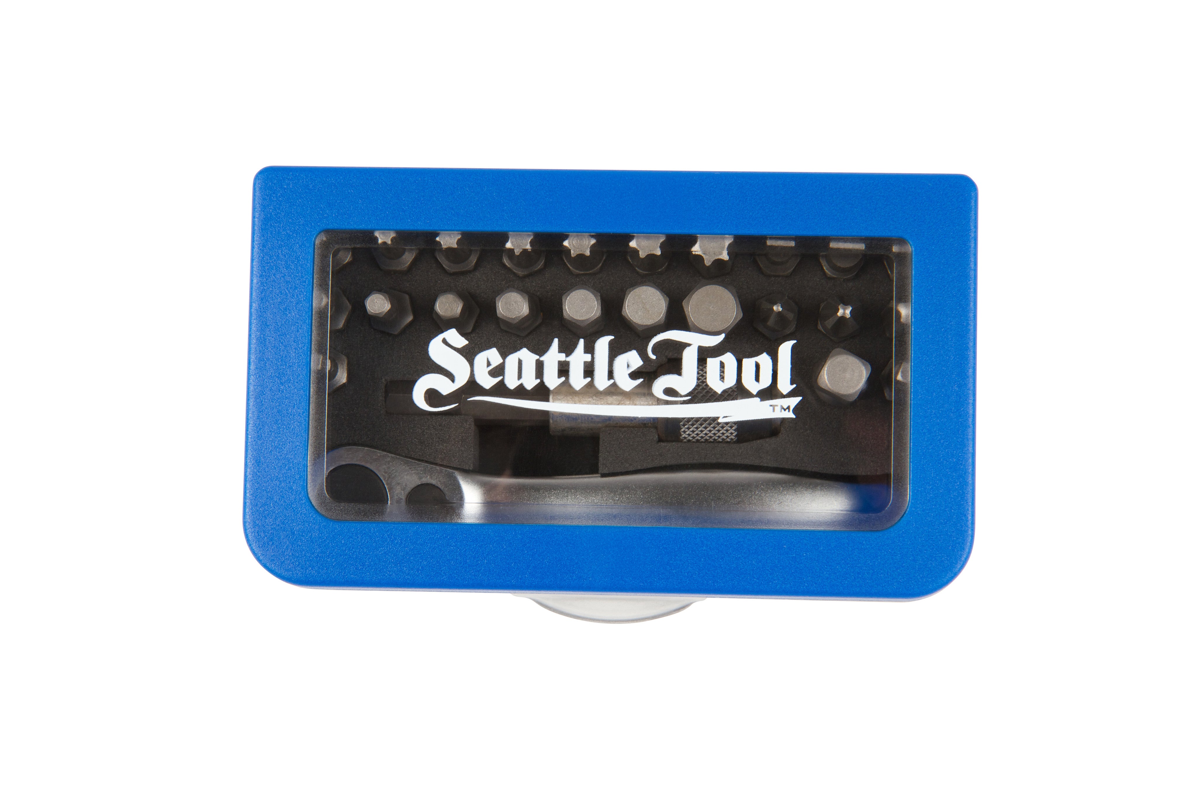 Perfect as a travel companion or practical gift, Seattle Tool's 1/4" Mini Ratchet and Bits Set comes with a precision 72-tooth mini bit ratchet and 22 bits including Slotted, Phillips, Hex, Square and Torx. Also included is a 1/4" drive adapter bit, a quick-release extension bit and a compact case.