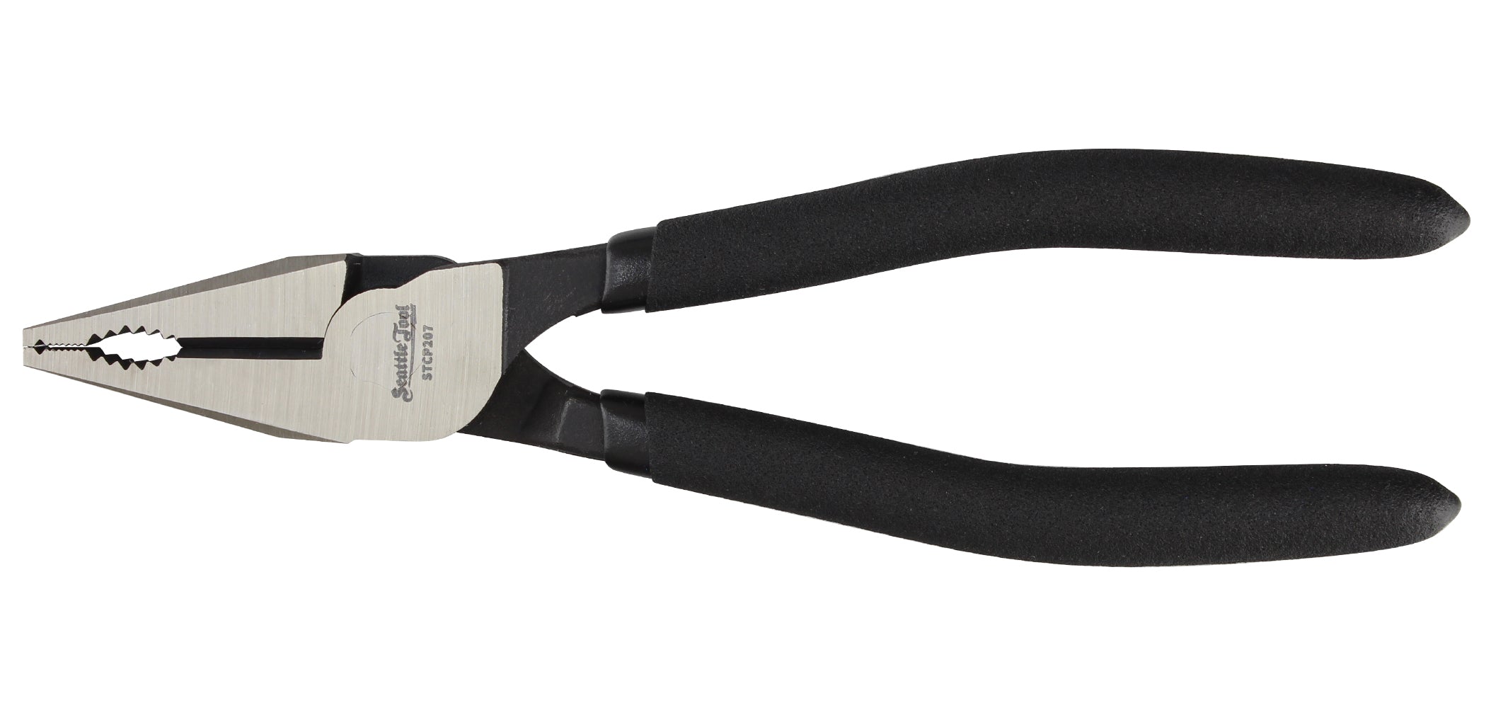 The Seattle Tool 7" Linesman Pliers is a premium, general purpose combination pliers. Pliers are precision forged, machined and heat-treated to provide excellent durability and strength. High leverage design reduces user exertion and fatigue. Cutting edges are precision ground and induction hardened for long lasting sharpness and repeated cuts. Low profile, compact design maximizes maneuverability and usability in tight spaces. Plier handles are double-dipped with a textured exterior to provide durability, comfort and control.