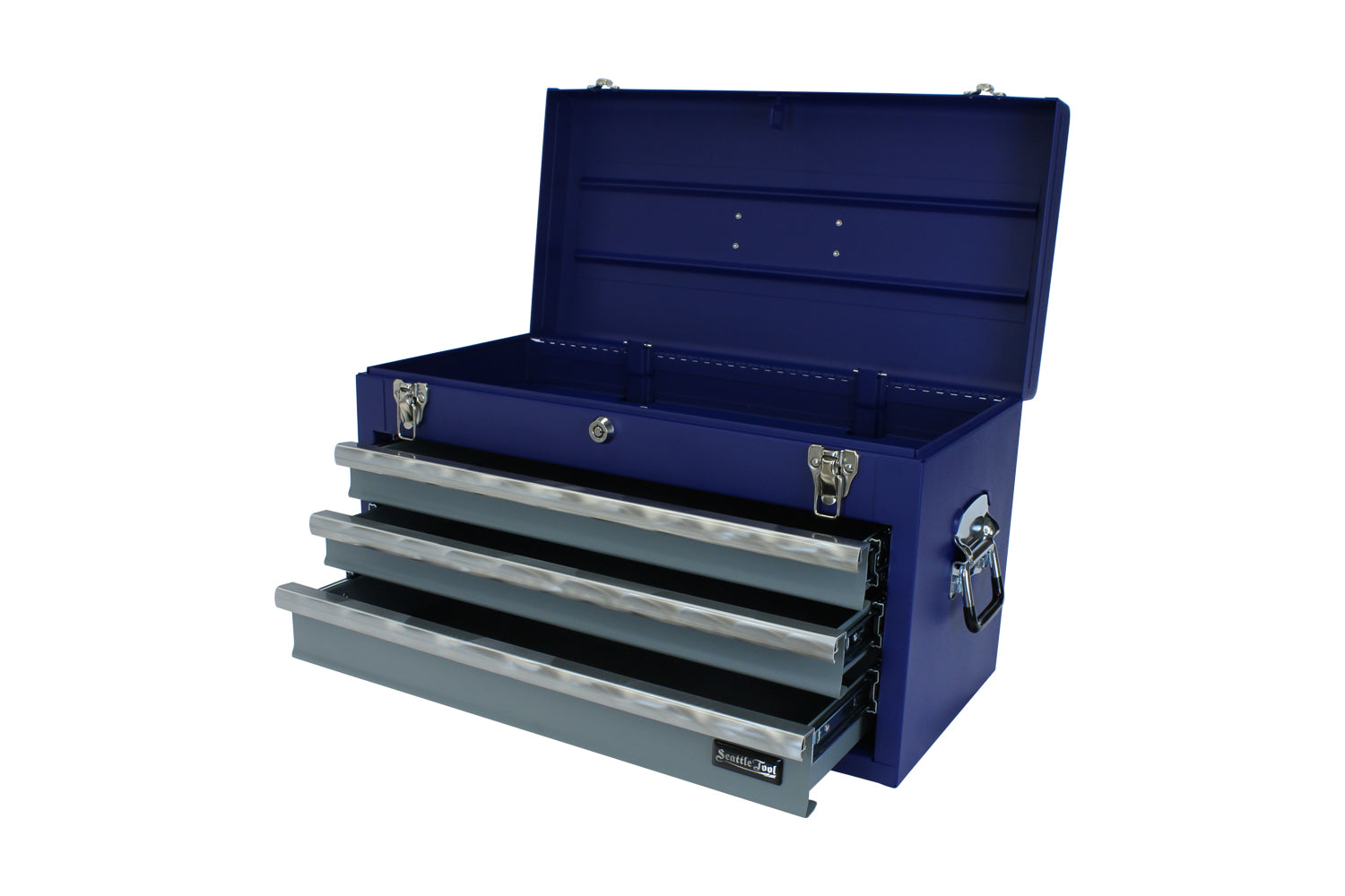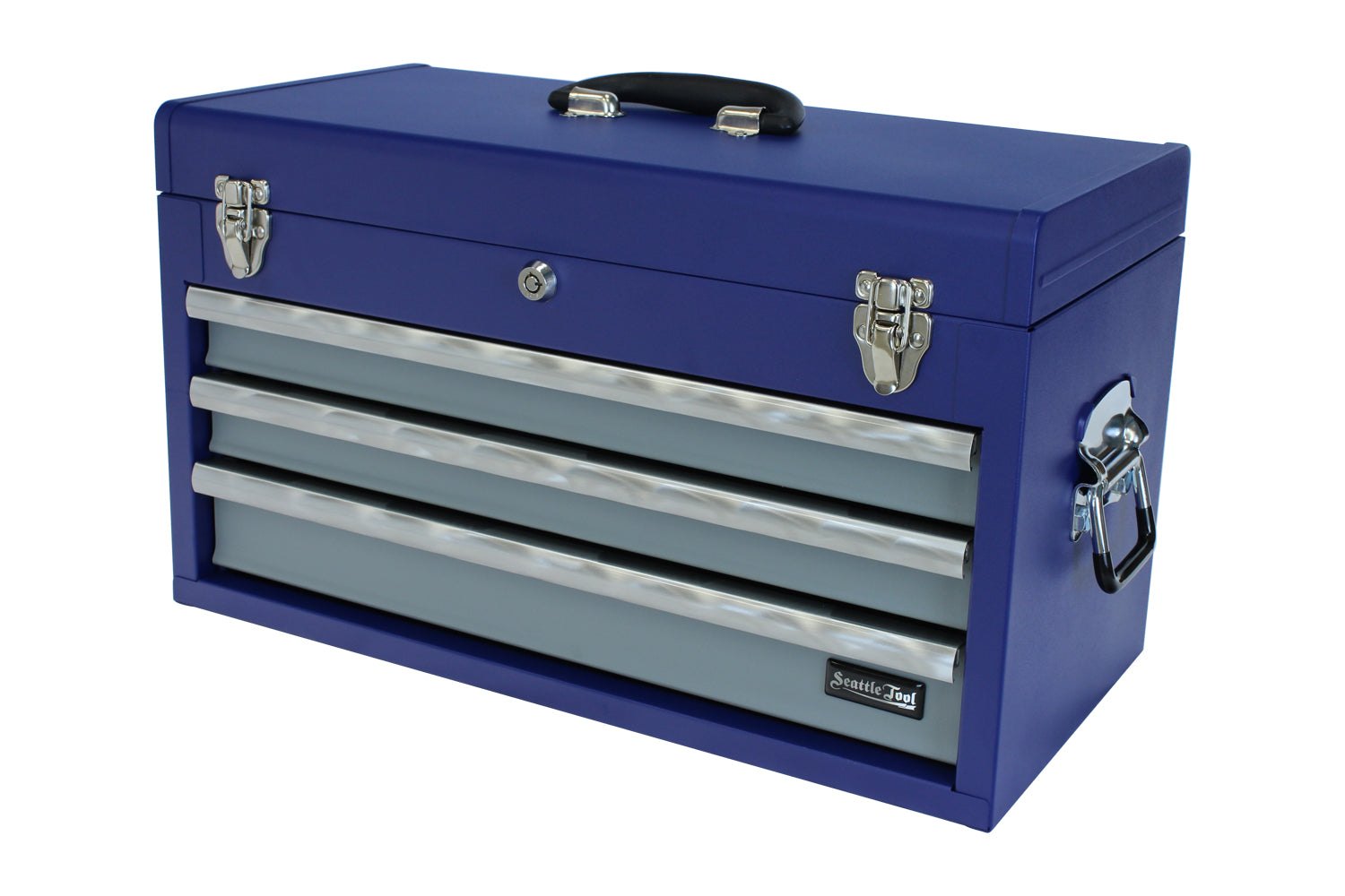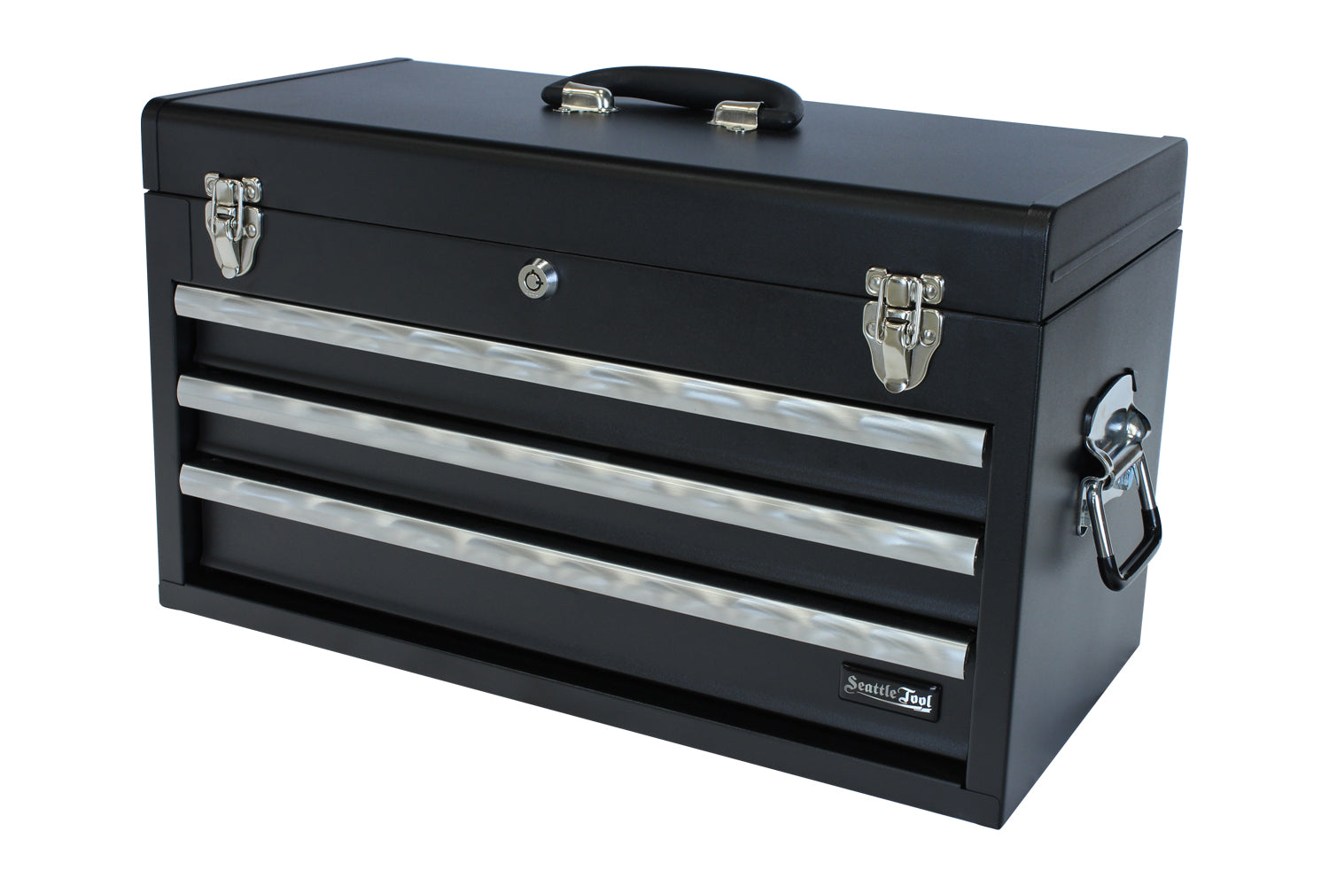 The Seattle Tool 20” Tool Chest is a tough and portable tool chest suitable for use in the shop, packed out to mobile jobs and out on adventures. The top lid compartment and three drawers allow for versatile storage for a wide range of tools, parts and supplies. Premium ball bearing slides ensure smooth and sturdy action. Reinforced chest lid and double-wall design result in a heavy duty box with lasting durability. Constructed from cold rolled steel with scratch, grease and solvent resistant powder coating. Secured with a tubular lock and keys.