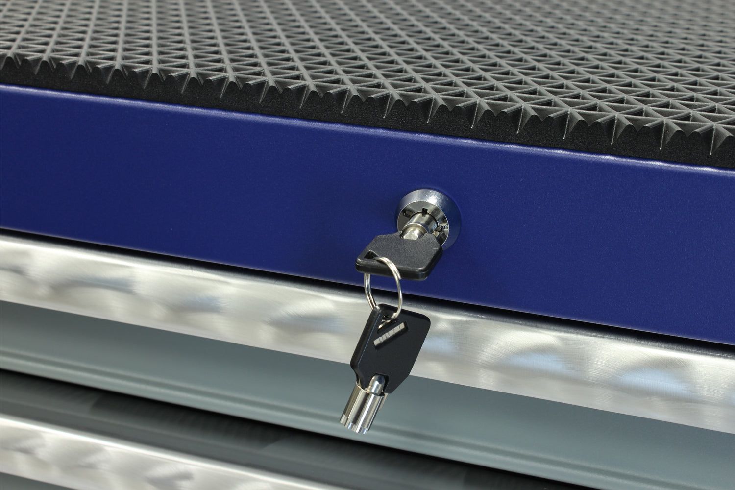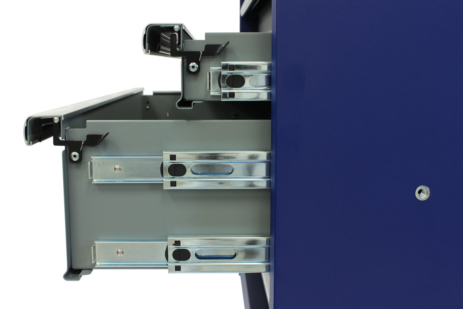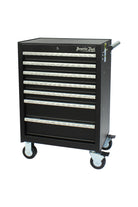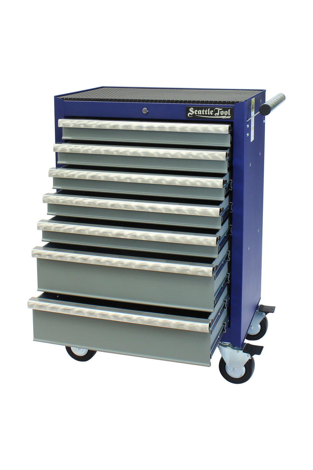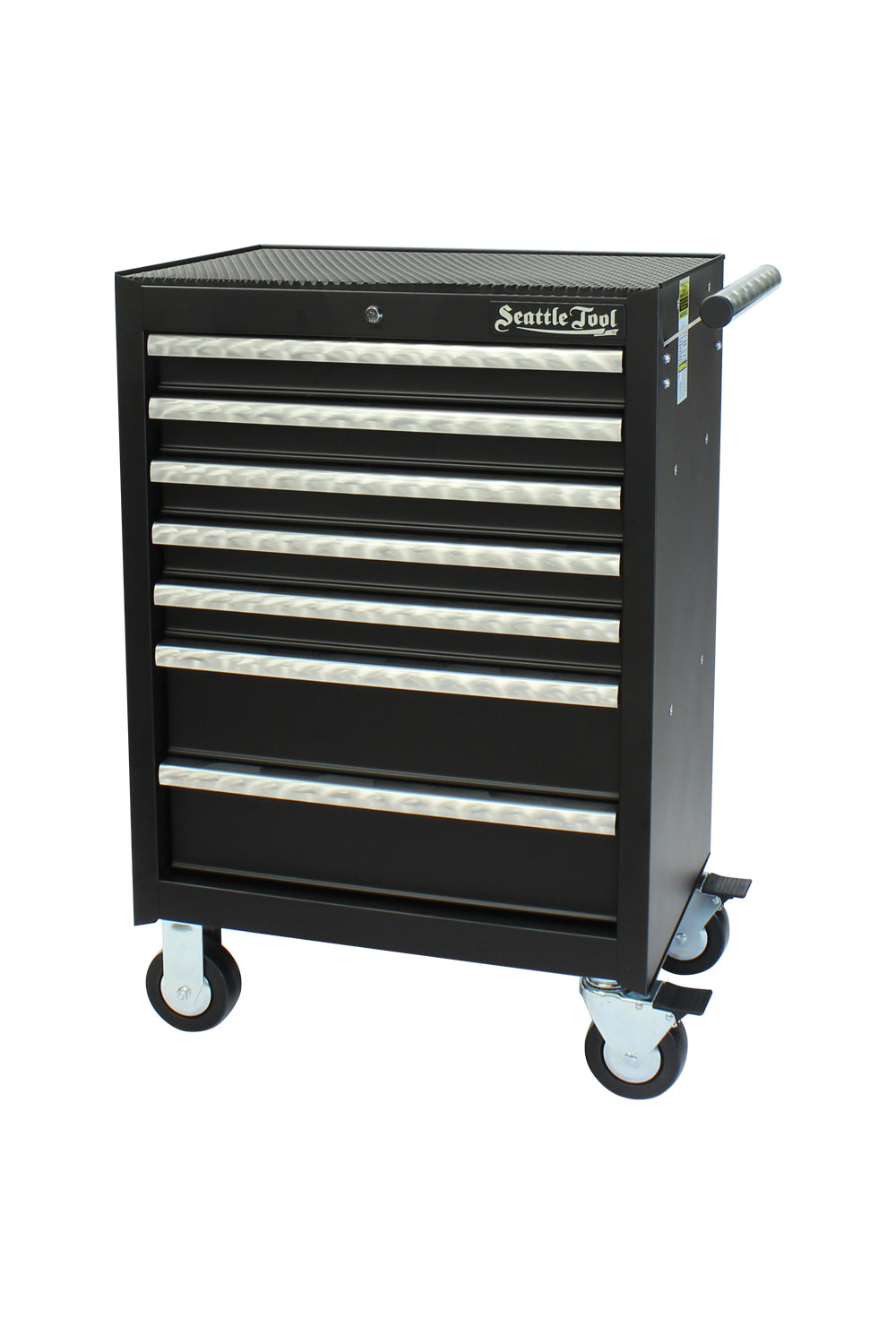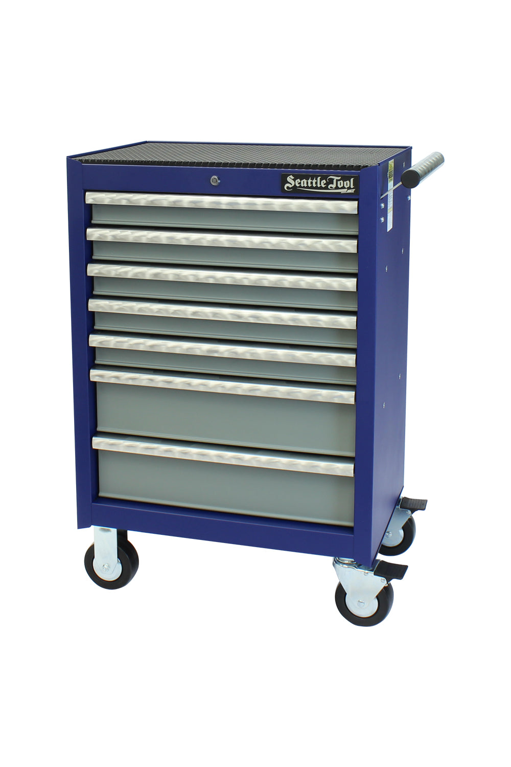 The Seattle Tool 26” 7 Drawer Tool Cabinet is a professional roller cabinet suitable for use in the garage and professional shops. Five standard drawers and two deep drawers provide secure storage for hand tools, supplies and power tools. Premium ball bearing slides ensure smooth and sturdy action for the stamp reinforced drawers. Anti-drift latches prevent drawers from drifting open while being easy and intuitive to operate. Double-wall design and high density welds result in a heavy duty box with lasting durability. Constructed from cold rolled steel with scratch, grease and solvent resistant powder coating. Secured with a tubular lock and keys.