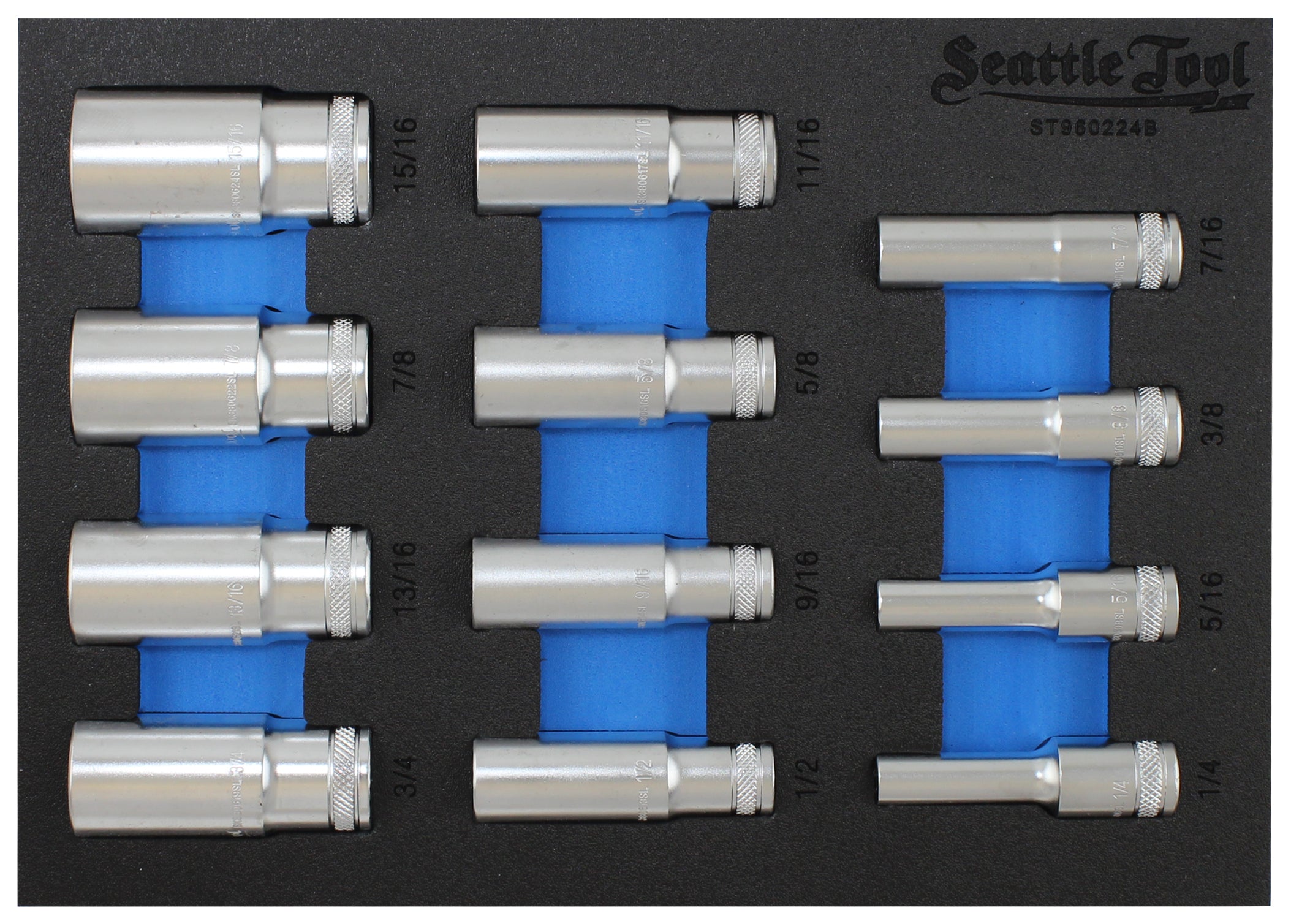 The Seattle Tool 3/8” Deep Socket Set in SAE is a complete 3/8" drive deep socket solution for the toolbox. The set features a full complement of premium 3/8” drive deep sockets in SAE sizes. Exceeding international standards, the sockets are designed to grip fasteners along their edges to increase grip and prevent rounding. Forged, machined and precision heat treated for strength and durability to tackle tough jobs. The diamond-pattern knurling on every socket makes them easy to grip and control. Stamped markings provide clear and permanent legibility for the lifetime of the socket. Finished in scratch, chip and corrosion resistant satin nickel-chrome plating. PE+EVA foam shadow tray keeps the tools organized and secured.