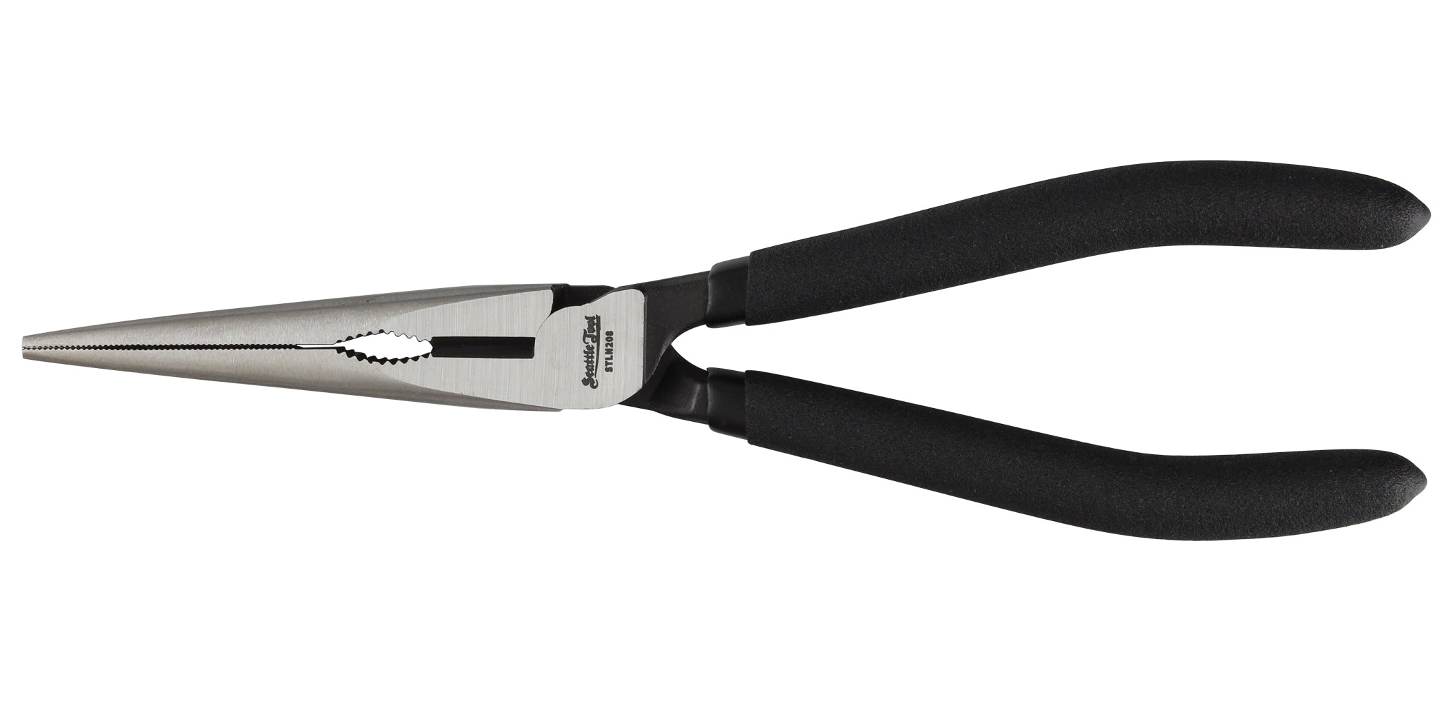 The Seattle Tool 8" Long Nose Pliers is a premium, compact long nose pliers. Pliers are precision forged, machined and heat-treated to provide excellent durability and strength. High leverage design reduces user exertion and fatigue. Cutting edges are precision ground and induction hardened for long lasting sharpness and repeated cuts. Low profile, compact design with a slim, long nose tip maximizes maneuverability and usability in tight spaces. Plier handles are double-dipped with a textured exterior to provide durability, comfort and control.